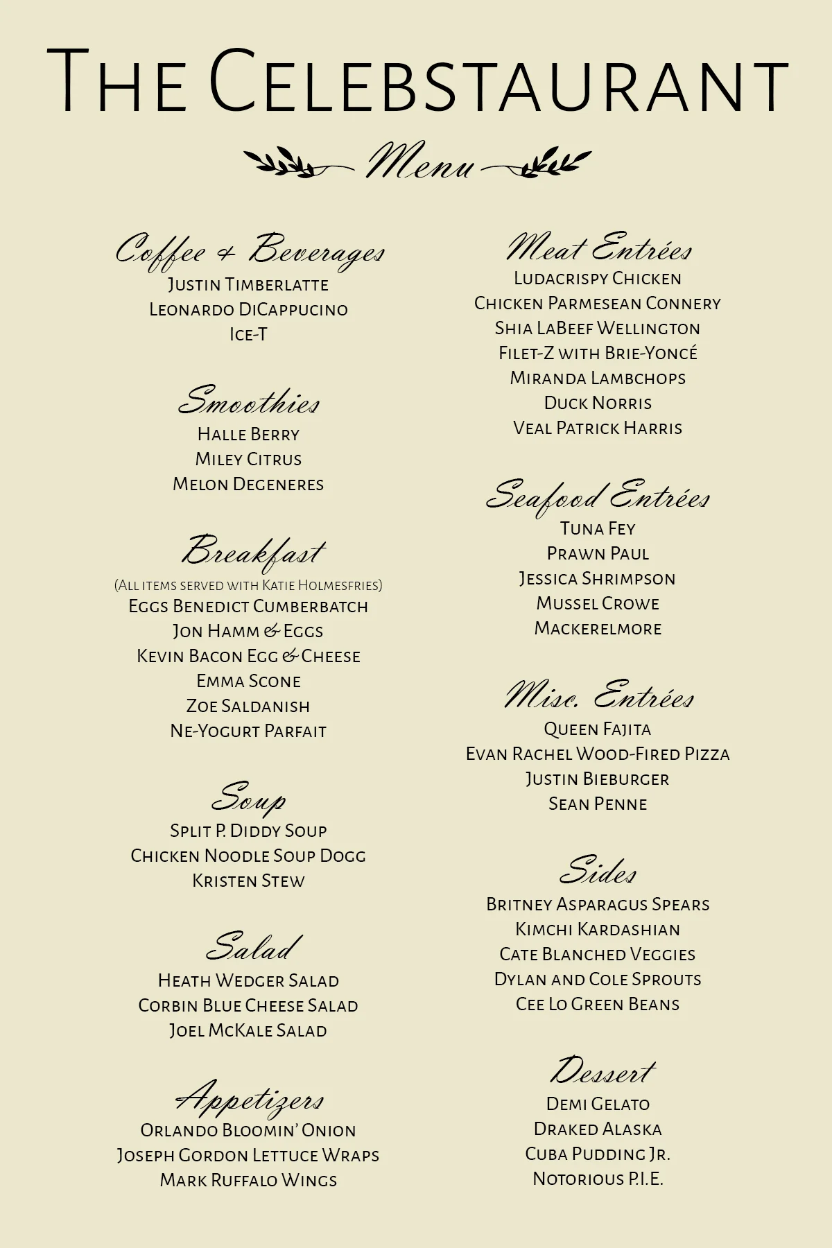 It started with a conversation with coworkers about how Channing Tatum kind of looks like a potato (Channing Tater). Next thing we knew, we had seven pages of celebrity food puns. I took our favorites and created a menu for The Celebstaurant.
